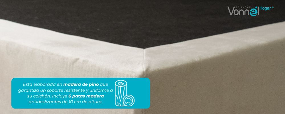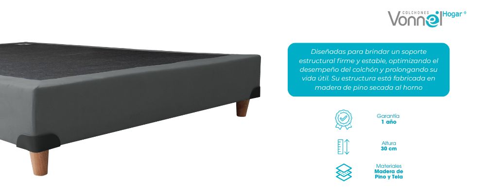 Nuestra base cama dividida de altura 30 cm está elaborada en madera de pino secada al horno que garantiza un soporte resistente y uniforme a su colchón incluye 8 Patas de metálicas desmontables de 10 cm de altura que brindan soporte y estabilidad.